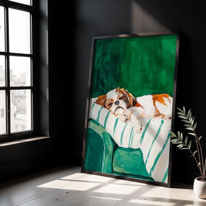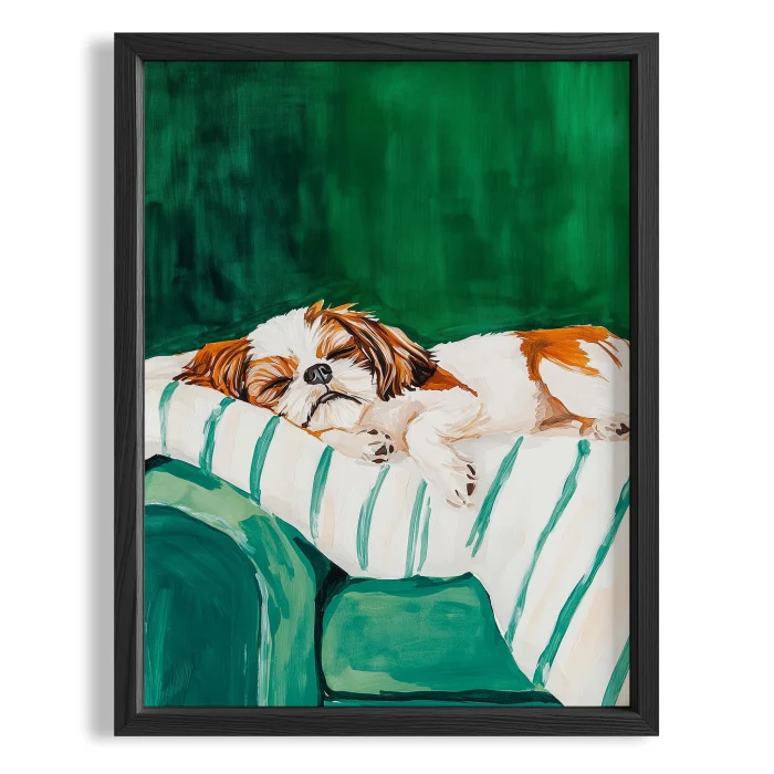 Product: Dog Portrait - Shih Tzu Striped Emerald Wooden Framed Wall Art