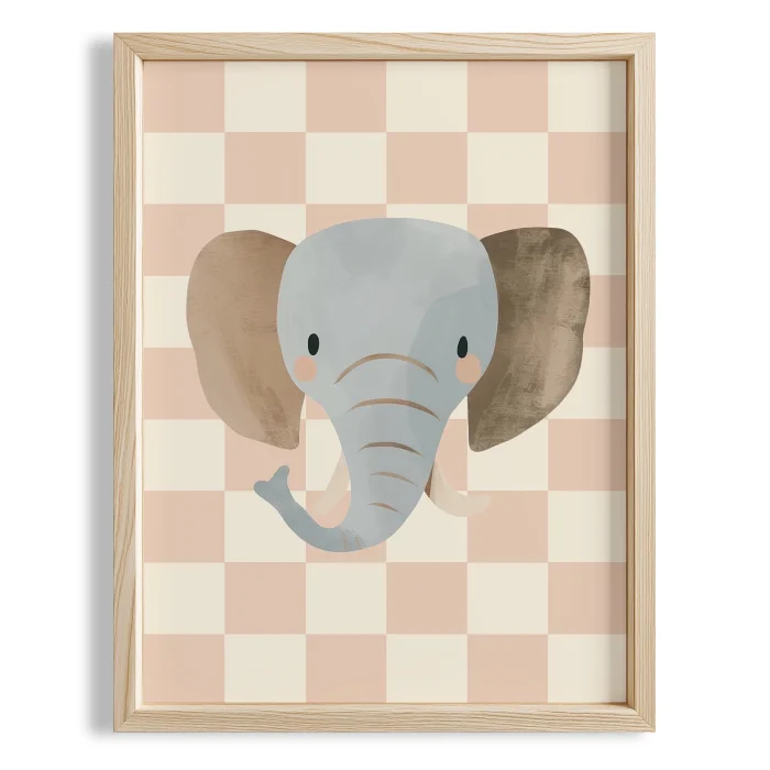 Product: Elephant Cute Safari Animals With Pink Checkered Background Kids' Room Wooden Wall Art