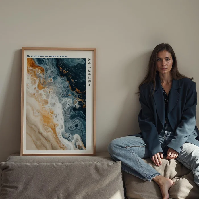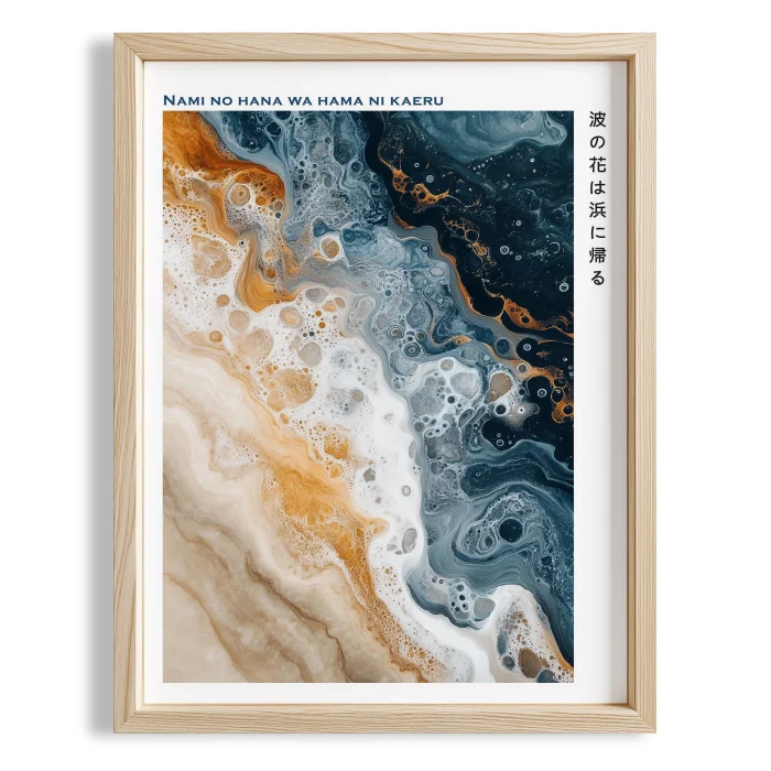 Product: Japandi Mavi Ve Bej Dalgaların Dönüşümü Wood-framed Art Print