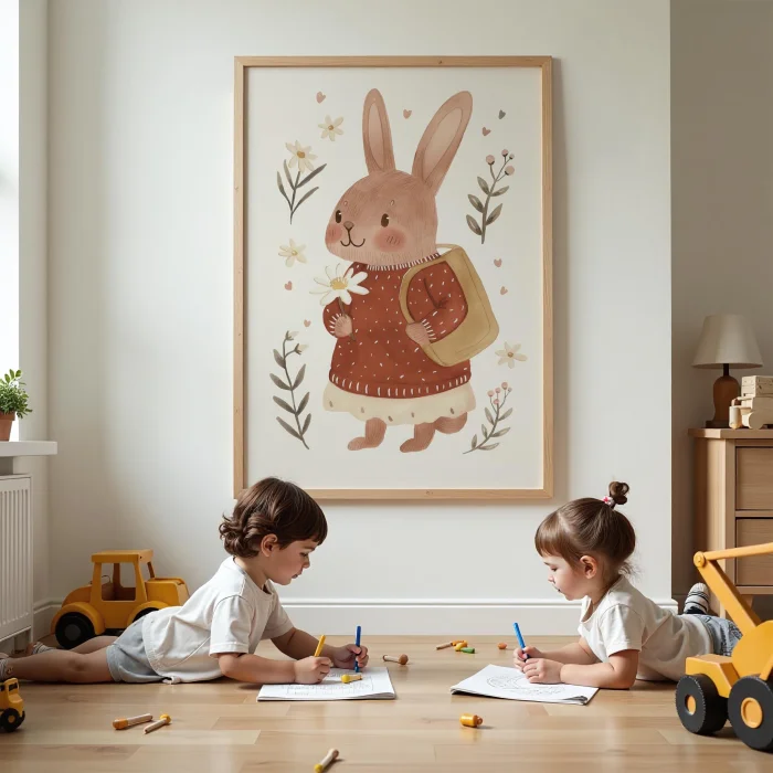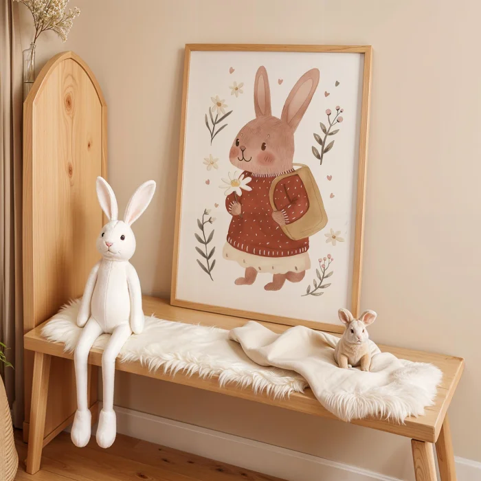 Cute Bunny With Bag And Flower Kids Room Wooden Wall Art