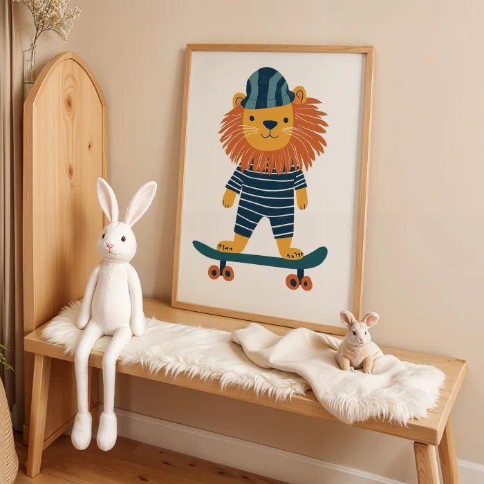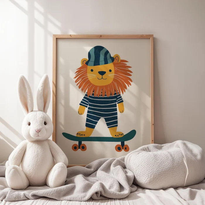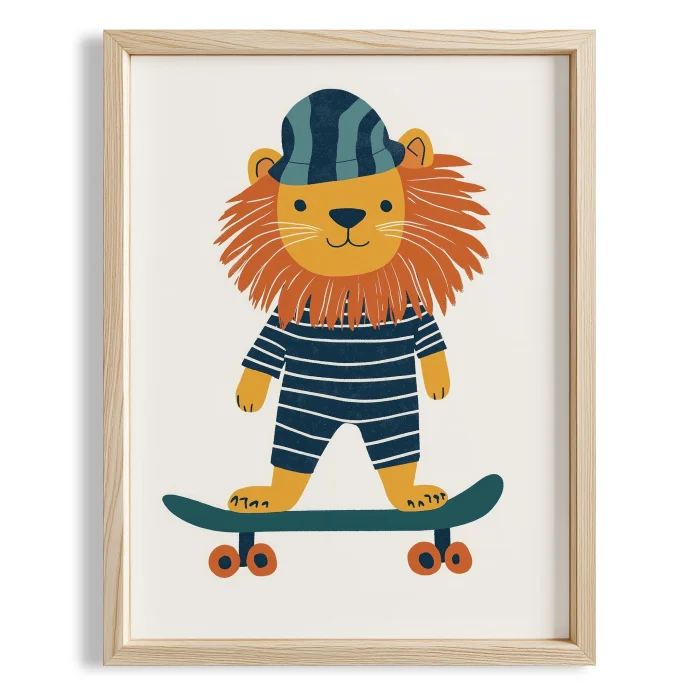 Product: Skateboarder Lion - White Background Children's Room Wooden Framed Wall Art
