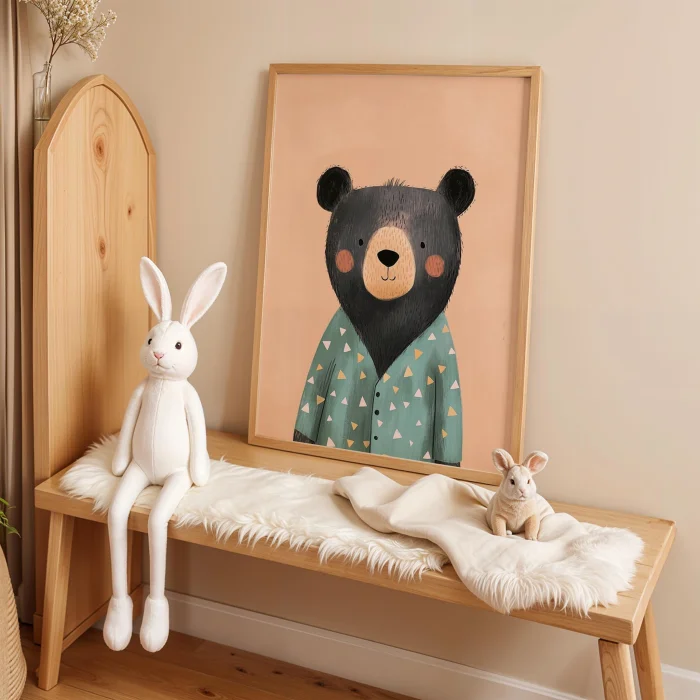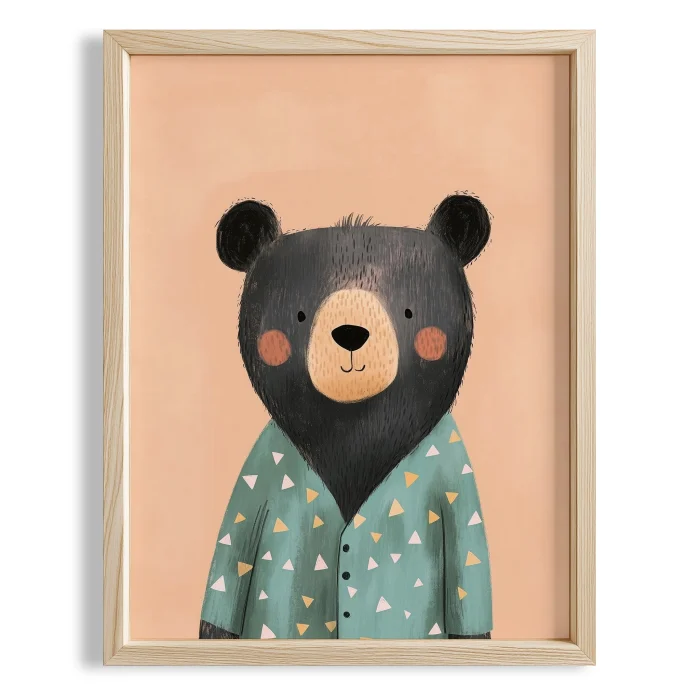 Product: Sleepy Bear In Pajamas - Salmon Background Natural Wood Framed Print