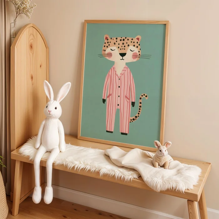 Product: Sleepy Cheetah In Pajamas - Green Background Natural Wood Framed Print