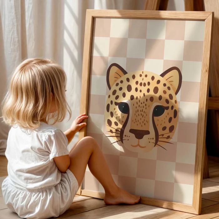 Product: Tiger Cute Safari Animals With Pink Checkered Background Kids' Room Wooden Wall Art