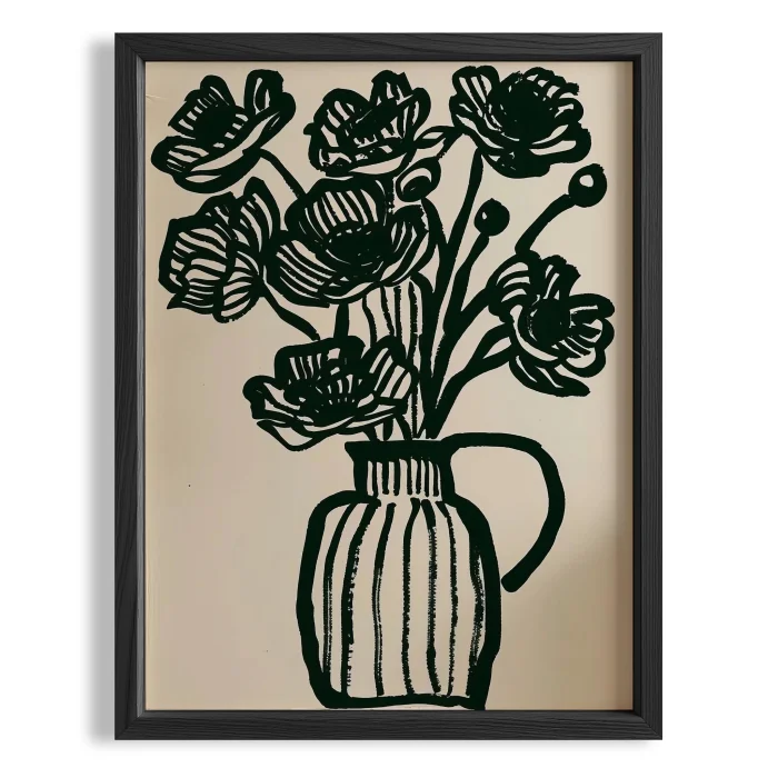 Product: Vazo Ve Çiçekler - Siyah Bej Wooden Framed Wall Art