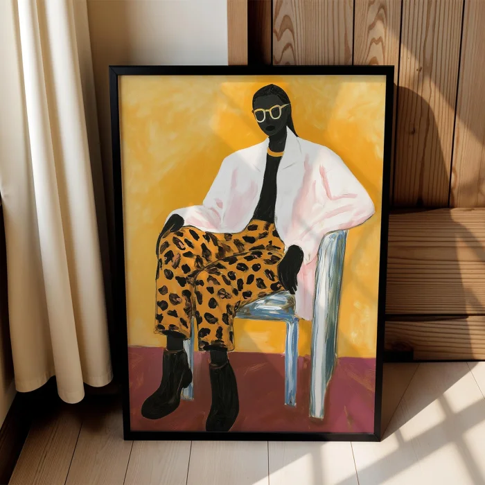 Product: Woman Portrait - Sarı Leopar Stil Wooden Framed Wall Art