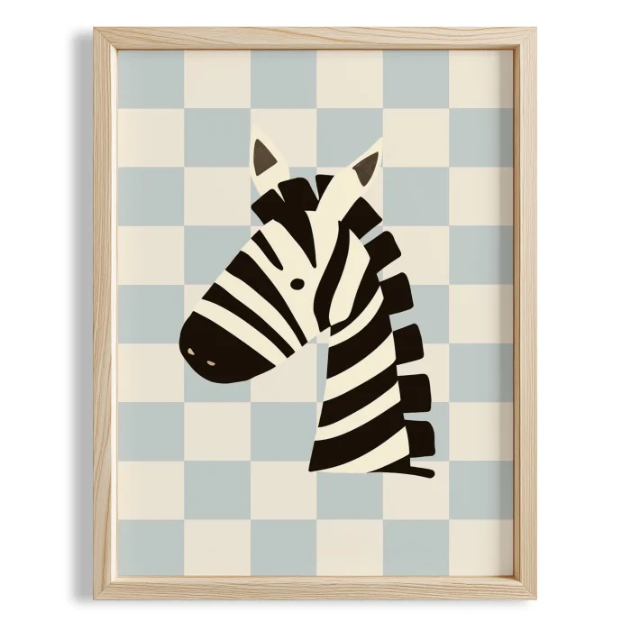 Product: Zebra Cute Safari Animals With Light Blue Checkered Background Kids' Room Wooden Wall Art