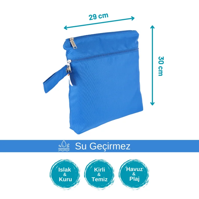 Versatile functional bags provide ease of use in many places such as wet / dry, dirty / clean, beach / pool, nursery. It is made of special fabric that is waterproof and does not contain carcinogenic substances. ; Thanks to its waterproof outer surface and waterproof inner lining, it allows you to separate your wet / dirty laundry from other items. ; It is suitable for Mother & Baby & Child & adult use.; It has a large internal volume of 30x 29 cm. ; It has two different zippered compartments. ; It has a writable name tag inside. With a single bag, you can carry both wet and dry at the same time.