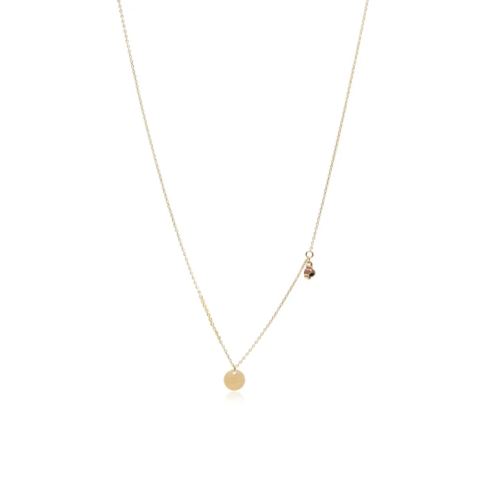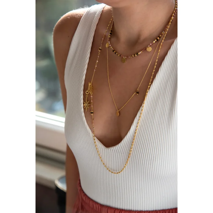 The 24K micron gold-plated thin chain necklace on brass is designed using tiger eye and moonstone and its length is 50 cm.
