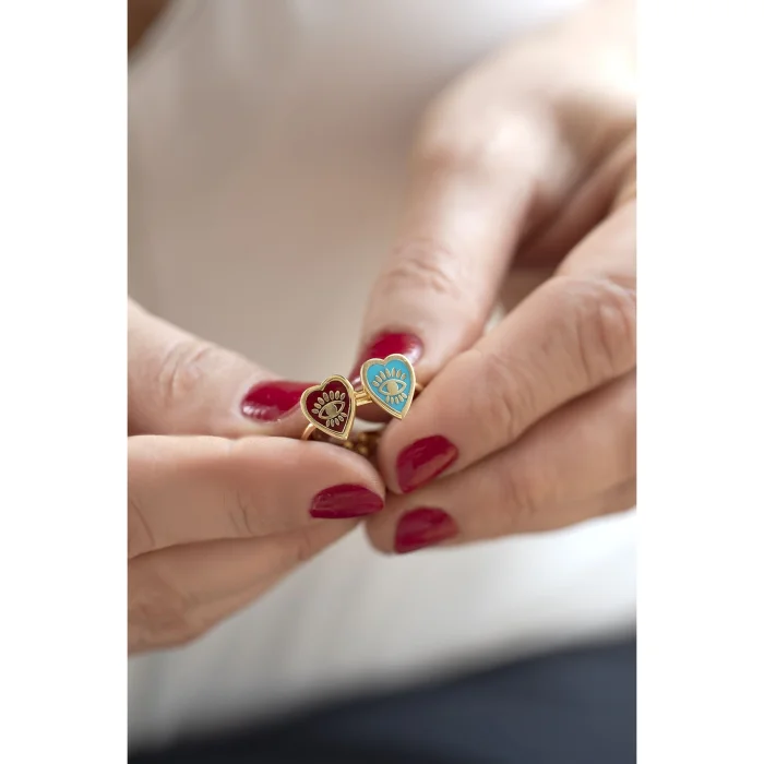 The size of the heart ring, colored with 24K micron gold-plated red enamel on brass, can be adjusted.
