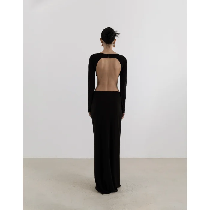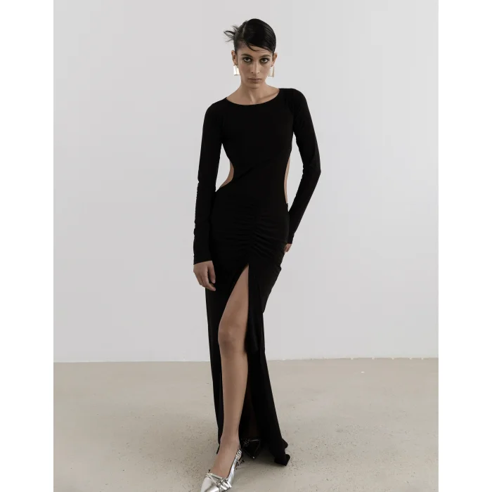 This Chemise dress captivates with its elegant character, romantic and minimal lines. The concept of a round neckline and a low back adds a distinct elegance along with a deep slit. ✓ Draped Detail ✓ Long Sleeve ✓ Round Collar ✓ Lined ✓ Jersey Fabric ✓ Length 59.06 inches ✓ Deep Rift ✓ Button Off