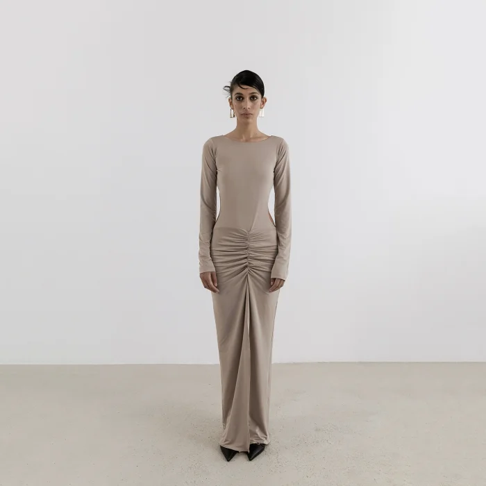 This Chemise dress captivates with its elegant character, romantic and minimal lines. The concept of a round neckline and a low back adds a distinct elegance along with a deep slit. ✓ Draped Detail ✓ Long Sleeve ✓ Round Collar ✓ Lined ✓ Jersey Fabric ✓ Length 59.06 inches ✓ Deep Rift ✓ Button Off