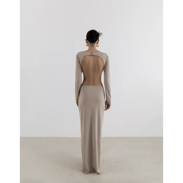 This Chemise dress captivates with its elegant character, romantic and minimal lines. The concept of a round neckline and a low back adds a distinct elegance along with a deep slit. ✓ Draped Detail ✓ Long Sleeve ✓ Round Collar ✓ Lined ✓ Jersey Fabric ✓ Length 59.06 inches ✓ Deep Rift ✓ Button Off