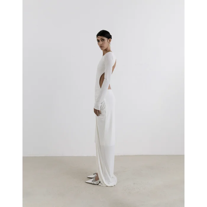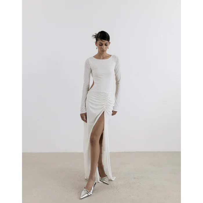 This Chemise dress captivates with its elegant character, romantic and minimal lines. The concept of a round neckline and a low back adds a distinct elegance along with a deep slit. ✓ Draped Detail ✓ Long Sleeve ✓ Round Collar ✓ Lined ✓ Jersey Fabric ✓ Length 59.06 inches ✓ Deep Rift ✓ Button Off