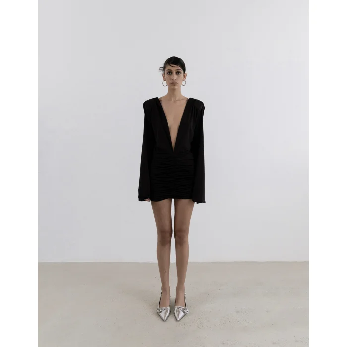 Details with modern charm add movement to the silhouette of the Spanish sleeved natte dress. The elegant design is complemented by padded details, a deep V-neck at both the front and back, and a flowing mini dress crafted from soft-textured fabric. ✓ Draped Detail ✓ Spanish Sleeve ✓ V-neck ✓ Lined ✓ Jersey Fabric ✓ Front Length 15.75 inches ✓ Skirt Length: 15.75 inches