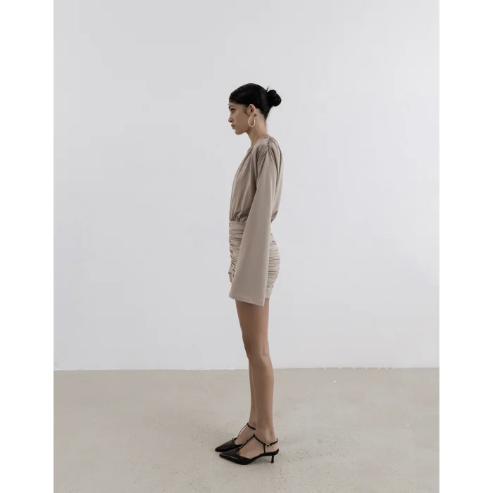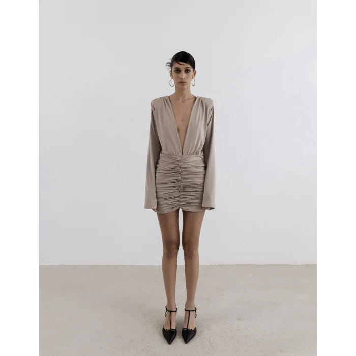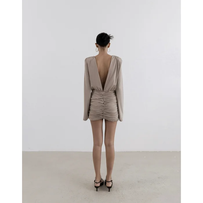 Details with modern charm add movement to the silhouette of the Spanish sleeved natte dress. The elegant design is complemented by padded details, a deep V-neck at both the front and back, and a flowing mini dress crafted from soft-textured fabric. ✓ Draped Detail ✓ Spanish Sleeve ✓ V-neck ✓ Lined ✓ Jersey Fabric ✓ Front Length 15.75 inches ✓ Skirt Length: 15.75 inches