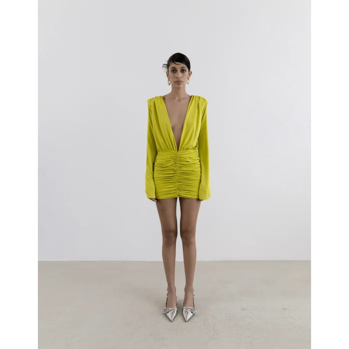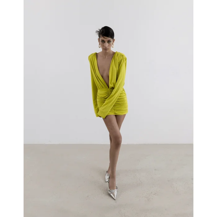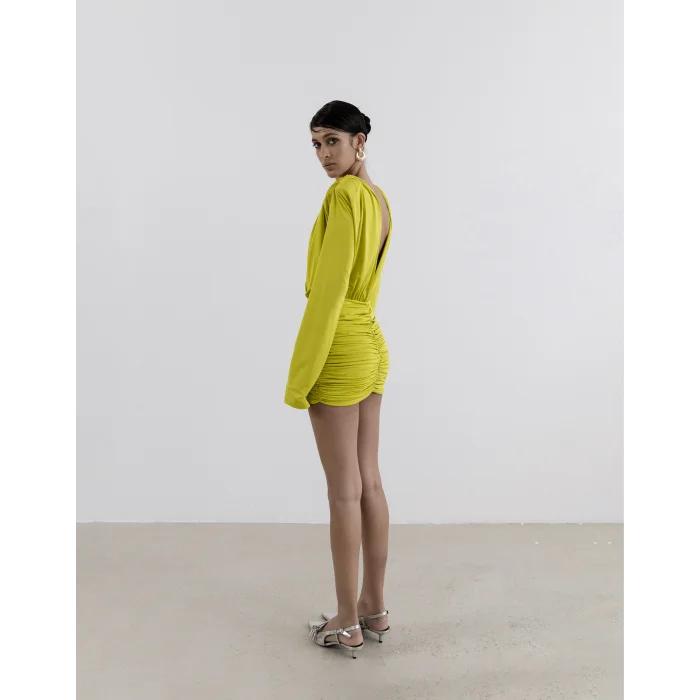 Details with modern charm add movement to the silhouette of the Spanish sleeved natte dress. The elegant design is complemented by padded details, a deep V-neck at both the front and back, and a flowing mini dress crafted from soft-textured fabric. ✓ Draped Detail ✓ Spanish Sleeve ✓ V-neck ✓ Lined ✓ Jersey Fabric ✓ Front Length 15.75 inches ✓ Skirt Length: 15.75 inches