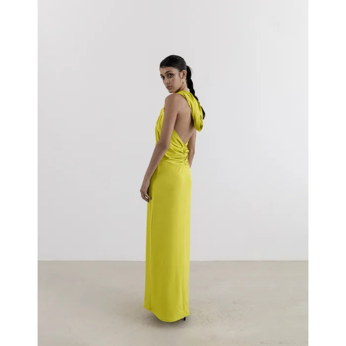 The form, which is defined by the back drawstring detail and the hat, creates a cross-bend detail on the front panel. ✓ Hat Detail ✓ Sleeveless ✓ Cross Collar ✓ Lined ✓ Jersey Fabric ✓ Length 59.06 inches