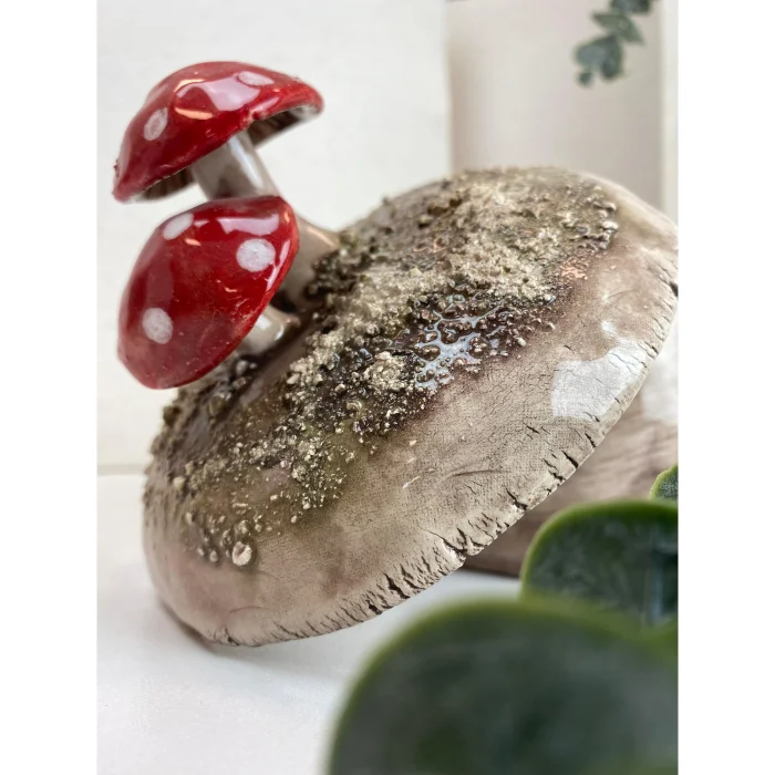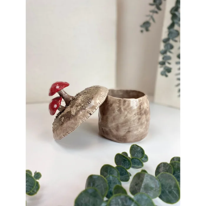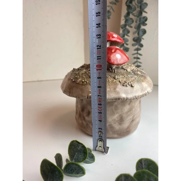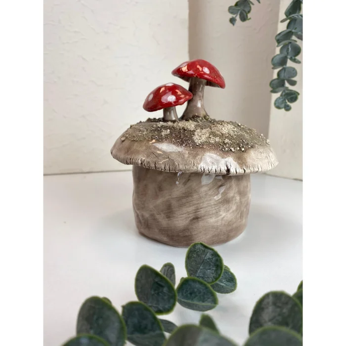 Features hand-sculpted mushroom details on the lid.