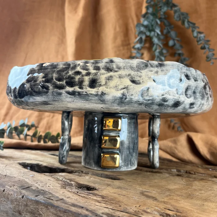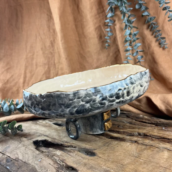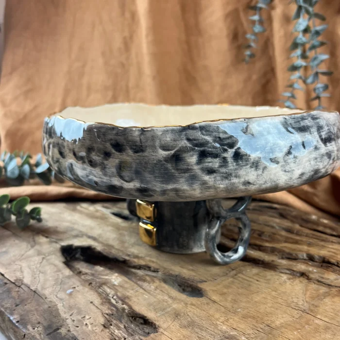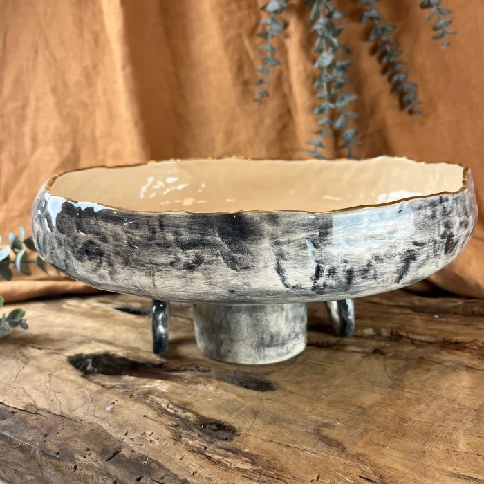 A completely handmade footed ceramic bowl crafted from stoneware clay, featuring imported underglaze paint, imported transparent glaze, and 24K gold detail.