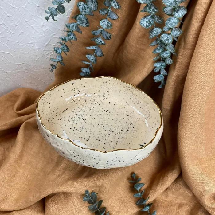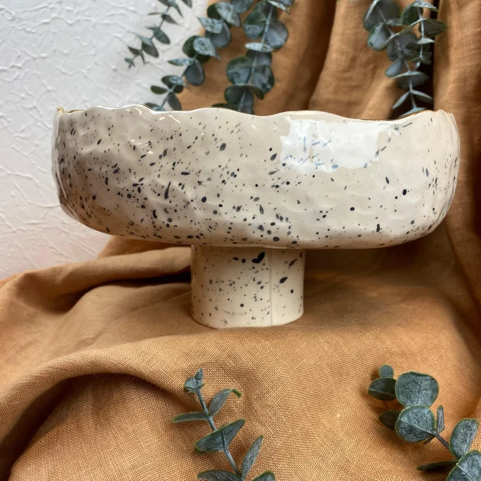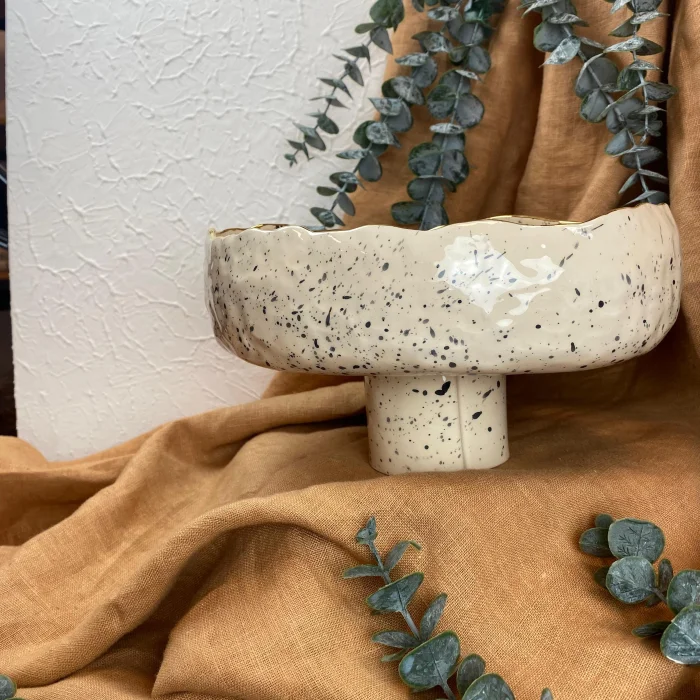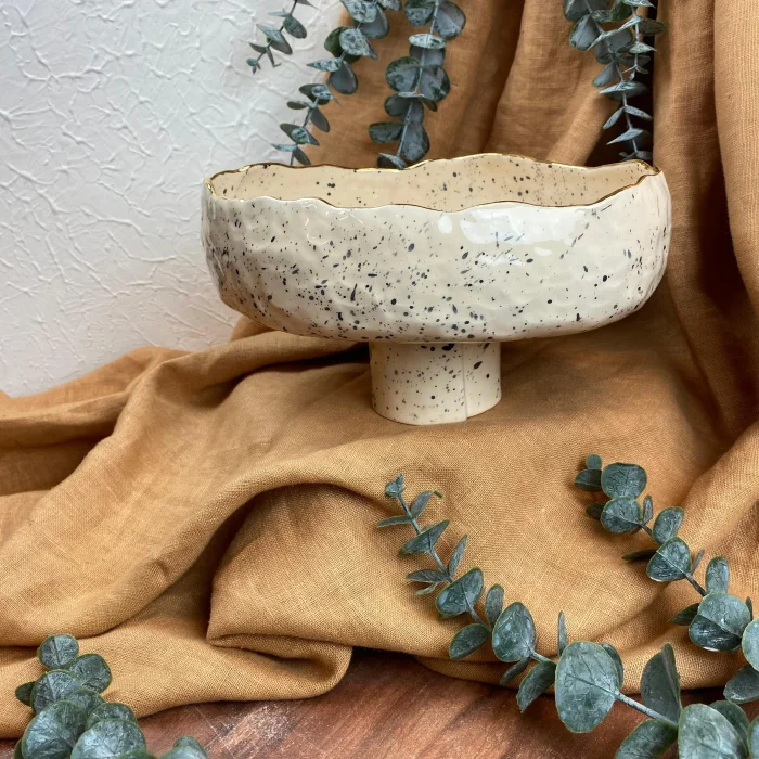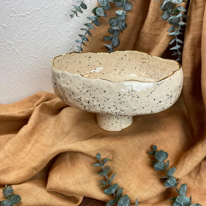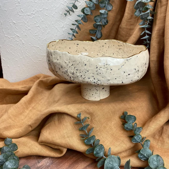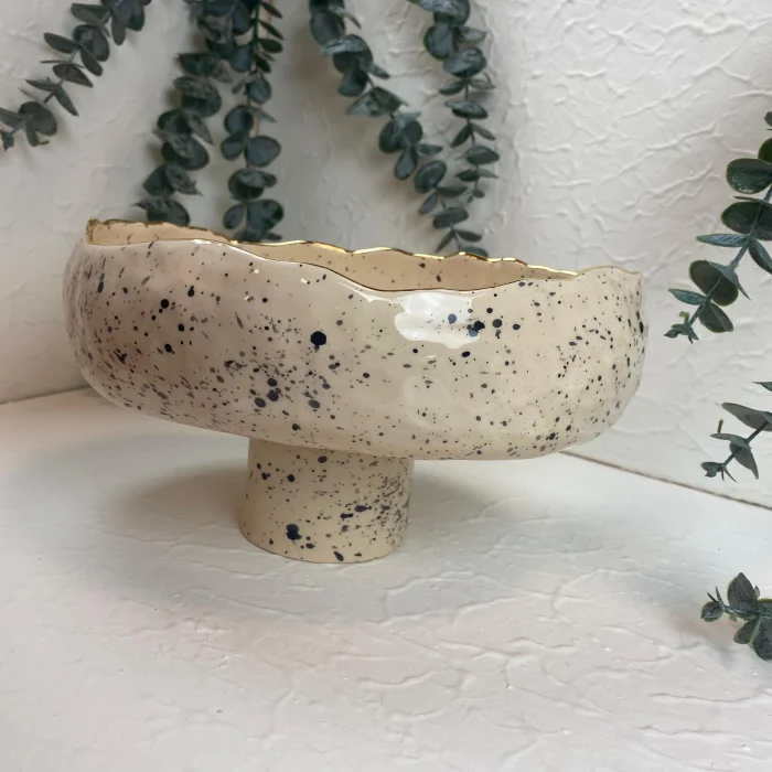 Product: Handmade Stoneware Footed Bowl - 24k Gold Edge Detail - Spotted Glazed Bowl - Women's Labor Production