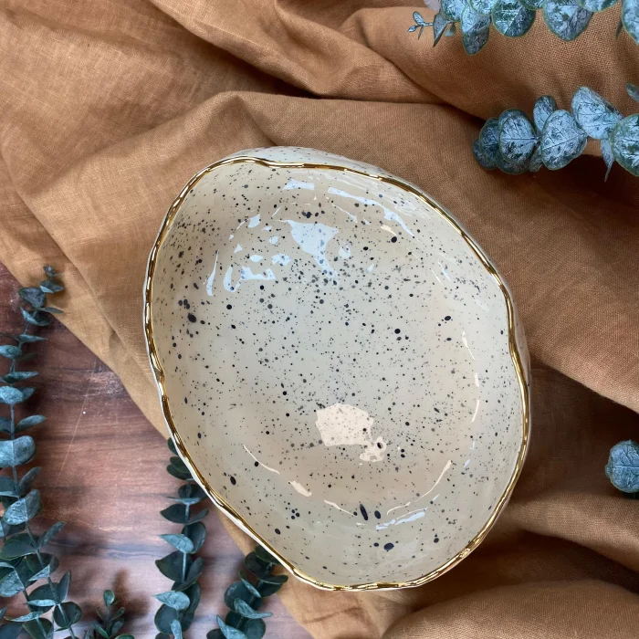 This distinctive free-standing ceramic bowl stands out with its high-temperature baked stoneware construction, natural mottled glaze surface and 24-karat gold gilding edge detail.