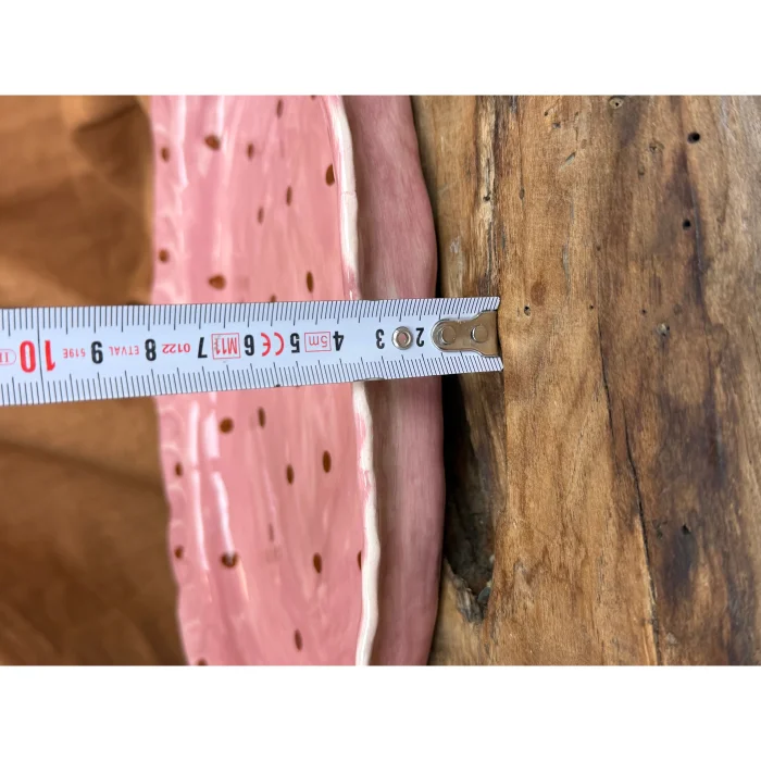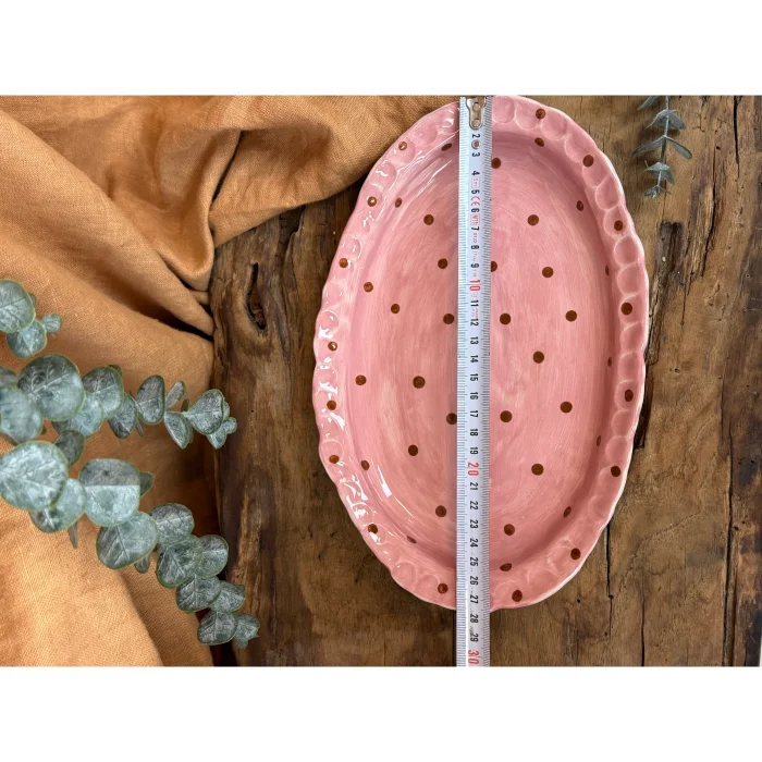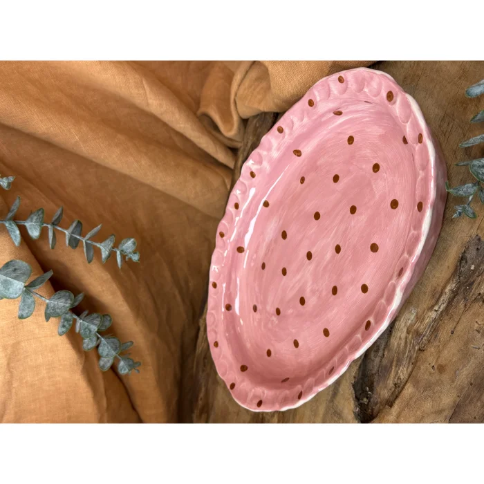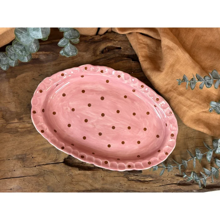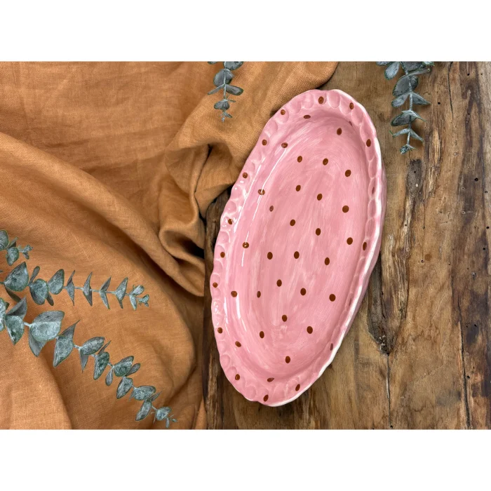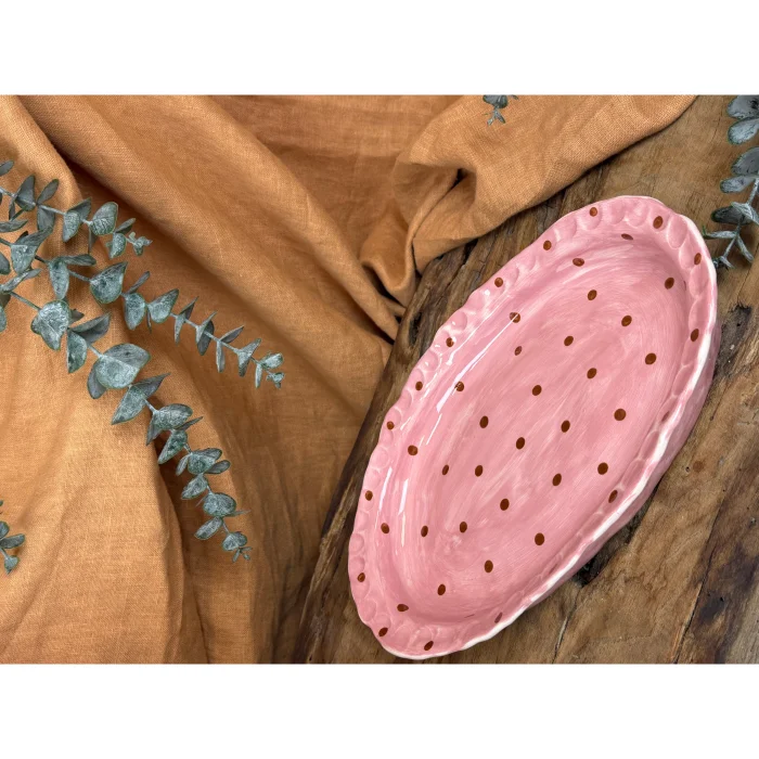 This fully hand-shaped ceramic serving & presentation plate features a soft powder pink distressed surface accented with warm brown polka dots, offering a nostalgic yet timeless aesthetic.