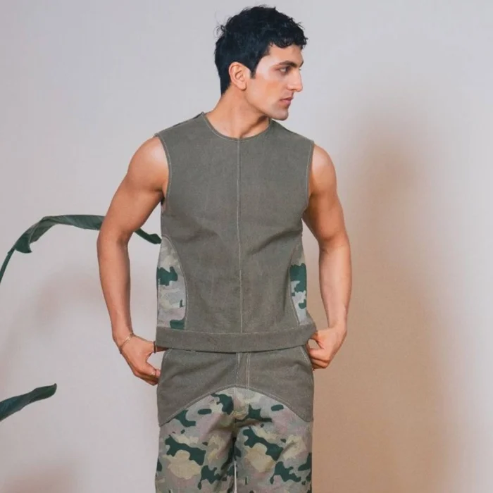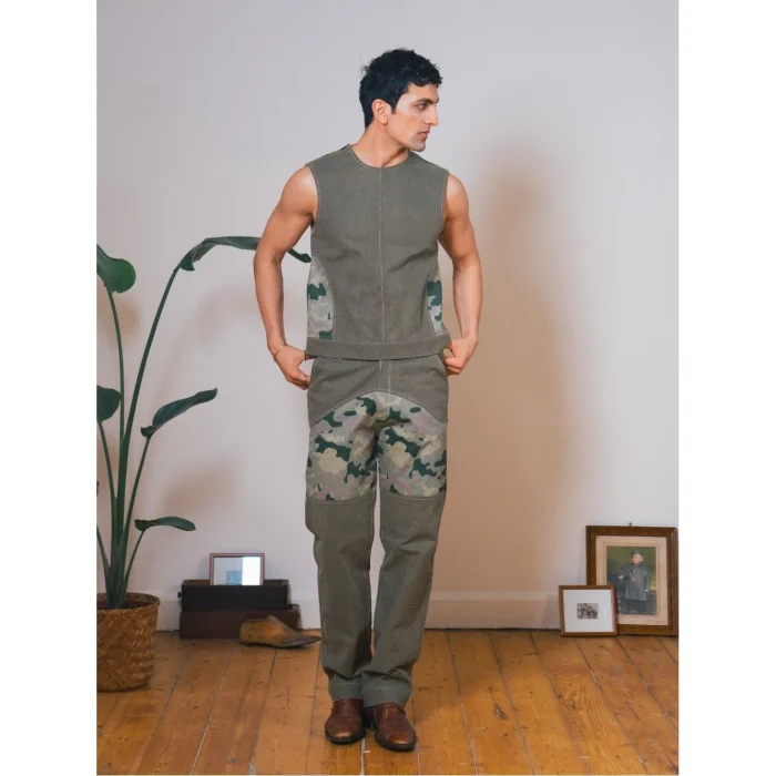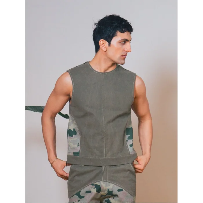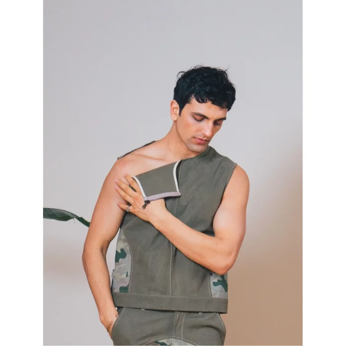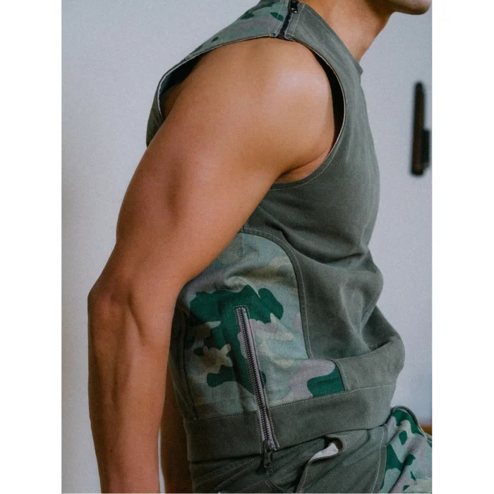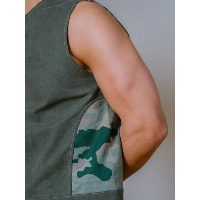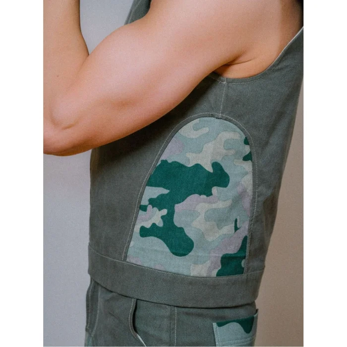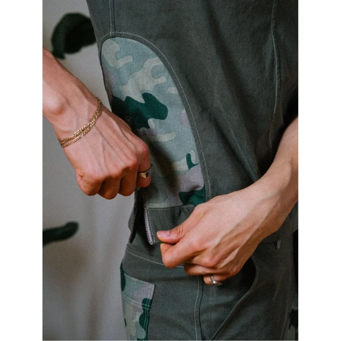 A waist-length vest inspired by the hunter's style. It draws attention with its shoulder zipper and side opening details. The combination of greenwashed canvas and camouflage offers a bold and structured look. It's a great choice for layered clothing or as an attention-grabbing piece.