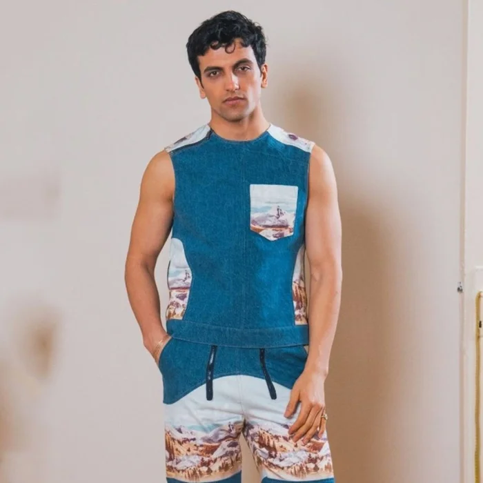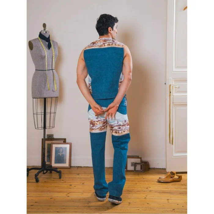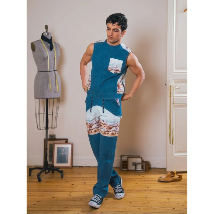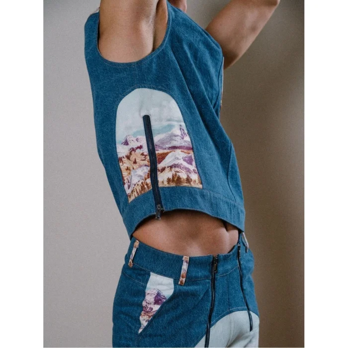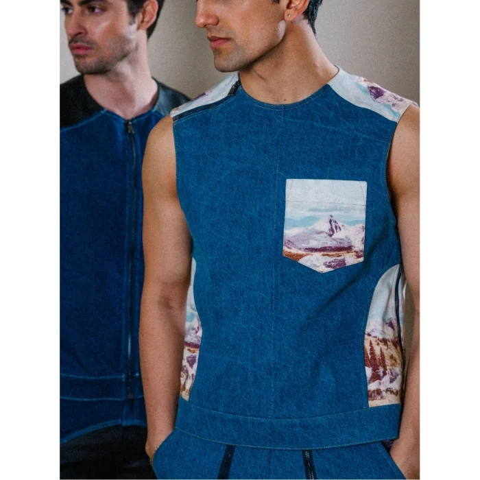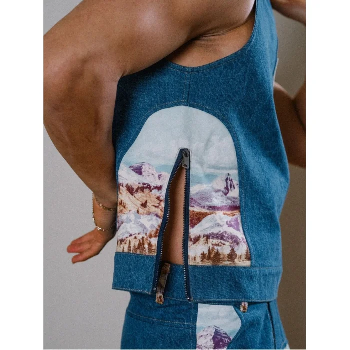 Inspired by the wild beauty of the Rocky Mountains, this vest stands out with mountain patterns paired with denim. The zipper details and shoulder openings on the sides add both style and functionality, creating a bold and adventurous look.