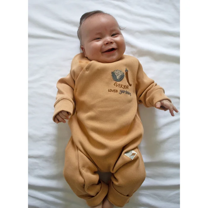• 95% organic cotton 5% elastane ribbed fabric – Certified • Full-length snaps on the front closure • Organic embroidery detail • Made in Turkey.