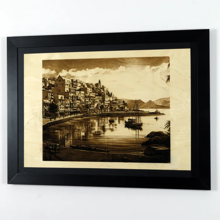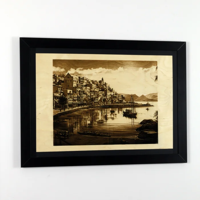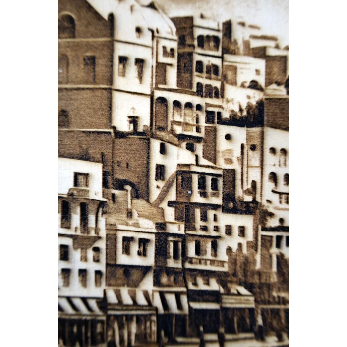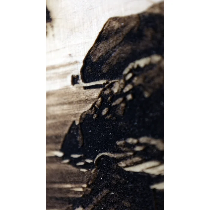 The painting is produced by laser engraving on plywood obtained from birch wood.