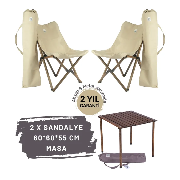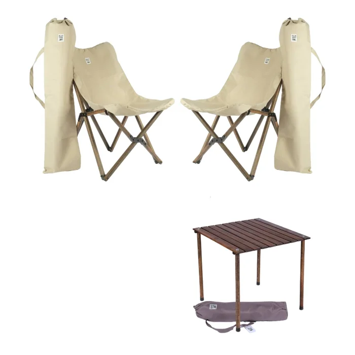 BAG THE JOY 50 * 50 * 50cm WOODEN ROLL FOLDING BROWN CAMPING & PICNIC TABLE + 2 BROWN WOODEN FOLDING CAMPING CHAIRS – BEIGE COVER