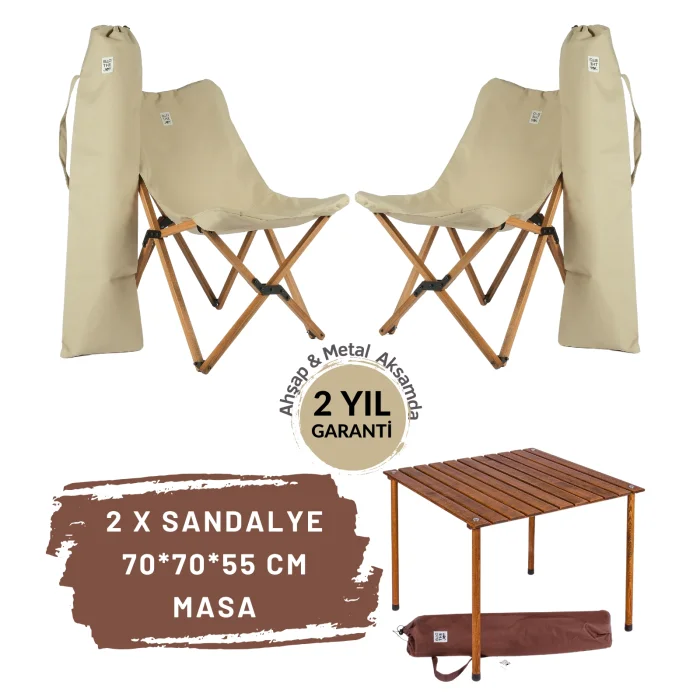BAG THE JOY 50 * 50 * 50cm WOODEN ROLL FOLDING BROWN CAMPING & PICNIC TABLE + 2 BROWN WOODEN FOLDING CAMPING CHAIRS – BEIGE COVER