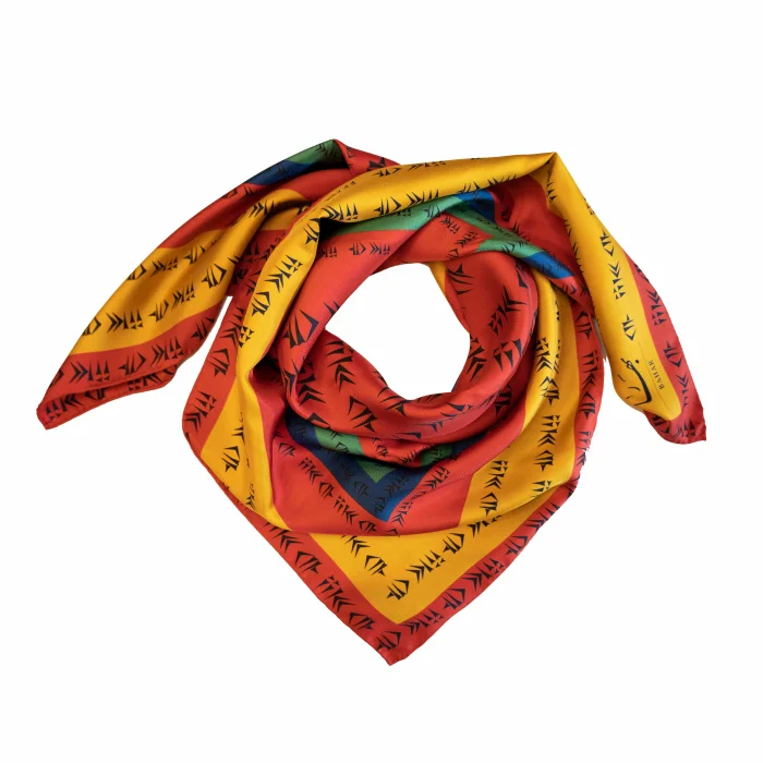 The fabulous scarf contrasts a repeating pattern of cuneiform lettering in black against a red background with sections of ochre yellow, green and blue. The cuneiform spells out the word ‘Love’.