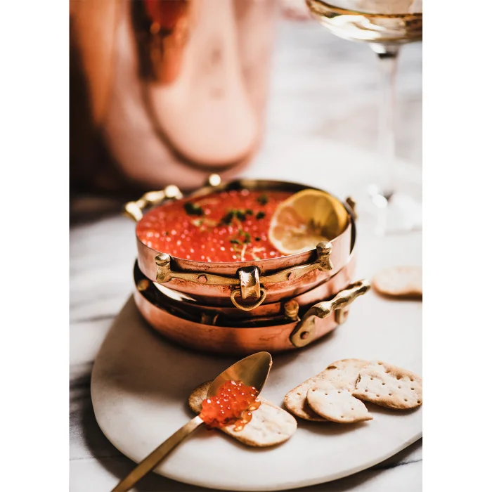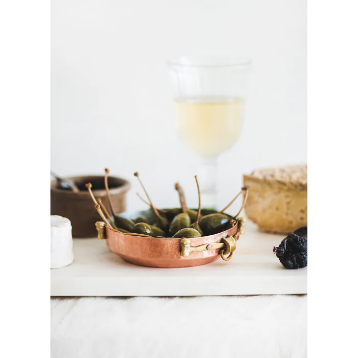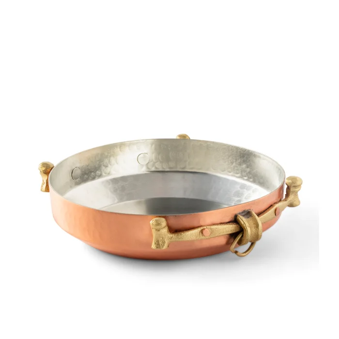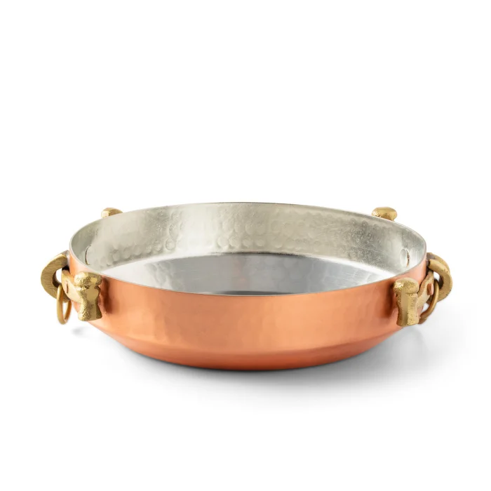Width: 11.5cm Height: 2.8cm Material: Copper body, tin plated inner surface, brass casting handles It is produced with traditional methods and handcraft. It is suitable for food use. Hand wash, dry with a cotton cloth and store.