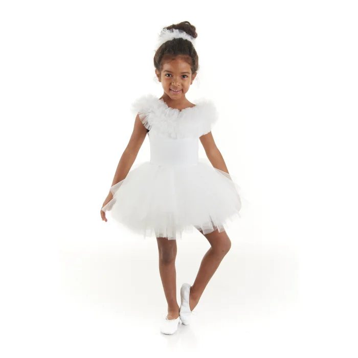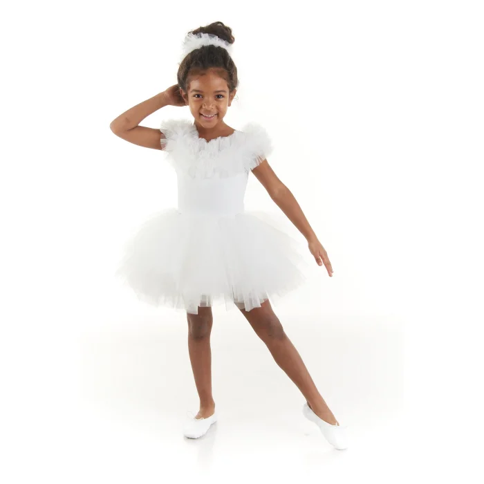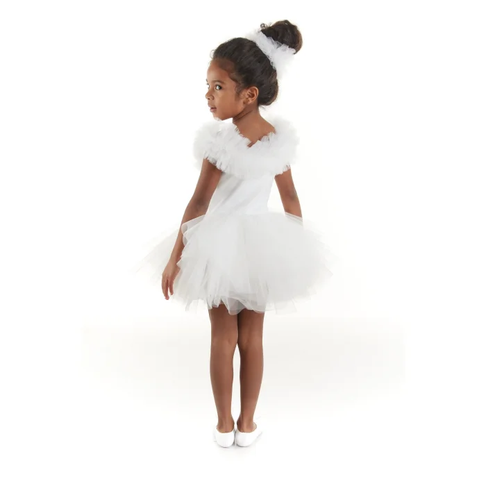 Our White Ballerina Dress is one of our oldest, most beloved looks. The top (bodysuit) part is made with an off white scuba fabric featuring a tulle neckline. Added onto the bodysuit are layers of white tulle, attached using a special technique for the extra fluffy and grand tutu skirt look.