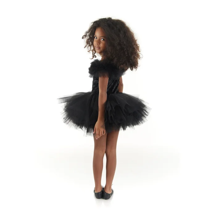 Our Black Ballerina Dress is one of our oldest, most beloved looks. The top (bodysuit) part is made with a black velvet fabric featuring a tulle neckline. Added onto the bodysuit are layers of black tulle, attached using a special technique for the extra fluffy and grand tutu skirt look.