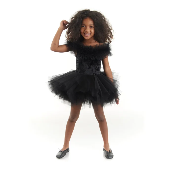 Our Black Ballerina Dress is one of our oldest, most beloved looks. The top (bodysuit) part is made with a black velvet fabric featuring a tulle neckline. Added onto the bodysuit are layers of black tulle, attached using a special technique for the extra fluffy and grand tutu skirt look.