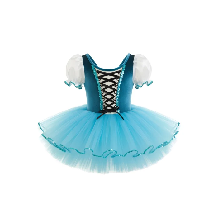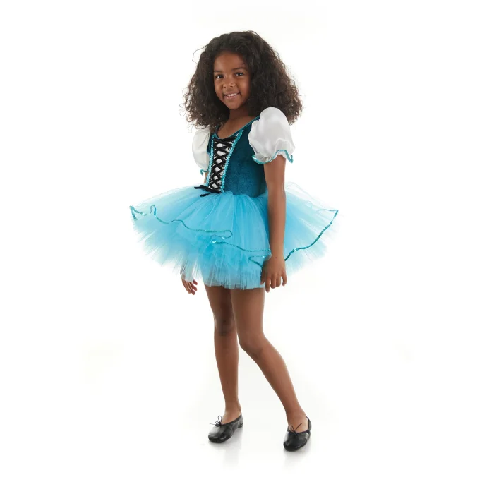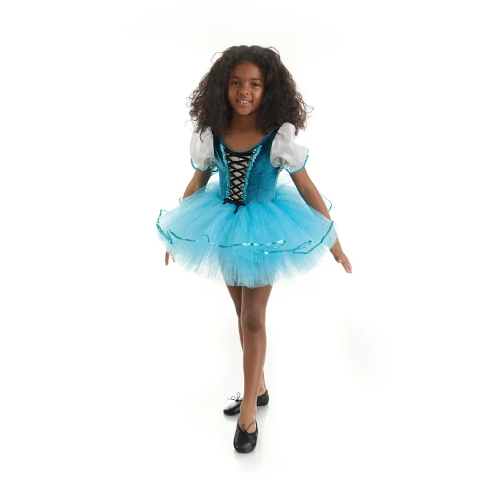 Blue Ballerina Dress is a comfortable tutu dress, embellished with lots of details, from the lining of the skirts to the sleeves. This is a special dress made for special ballerinas. The bodysuit with snaps is attached to the skirt and is made from a velvet fabric. The skirt is made from tulle stitched together with a special technique for extra fluffiness. Although often preferred for dance recitals, this dress is great for any special occasion especially birthday parties!