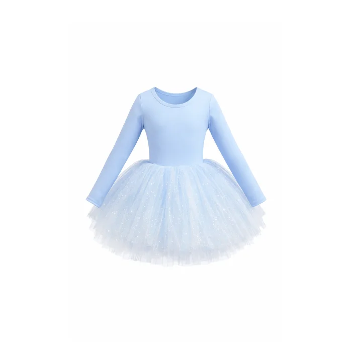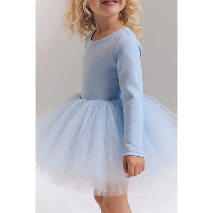 The Eis Blue Tutu Dress features a soft, long-sleeve bodice in a pale icy blue, paired with a full, layered tulle skirt designed for movement and softness. The top layer is crafted from blue, sparkle-dotted tulle, floating over layers of white tulle beneath, creating depth, lightness, and a subtle frosted effect with every step.