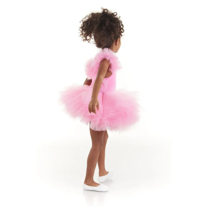 Pink Tutu Dress is the perfect fit for a little ballerina. This dress is very fun and playful with its tulle sleeve details and fluffy tutu skirt while still being very soft comfortable. The top part is made out of soft, stretchy pink velvet and feels comfortable enough to wear it on a regular day.