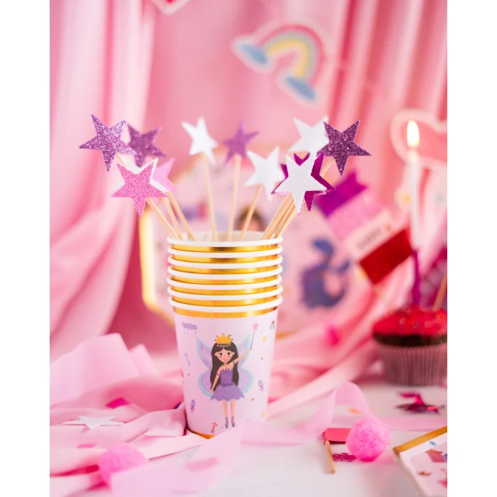 Set of 8 paper cups, with gilding details. Princess - fairy and royal carriage patterned, special design. It is suitable for contact with food. Height 9.7cm, 0.280 ml.