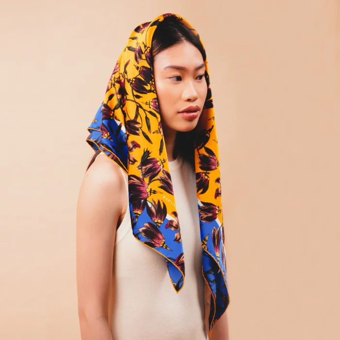 100% Silk Satin. This Baptiste scarf has been made in England from smooth silk satin and digitally printed with the signature floral print motif. It's outlined by a contrasting saffron orange bold border, that really makes it pop. It's made from pure luxurious silk and printed in a variety of bold colourways. Using a vibrant colour technique to produce this iconic pattern, its generous colour penetration on both sides makes it perfect for tying at the nape of your neck or over the shoulder for a luxurious drape.
