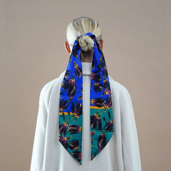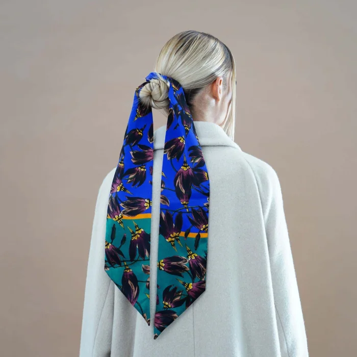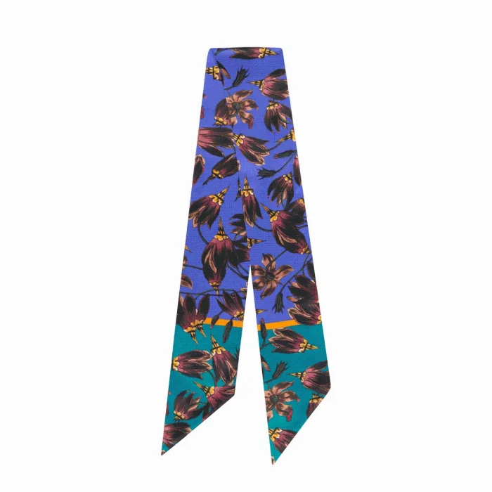 Made of pure soft silk this essential accessory is printed with a graphic floral print, playfully patterned against a vibrant colourful backdrop to lift any outfit. This versatile twilly scarf can be worn in many ways to adorn your look – twirled around your neck, at the waist or as a headband.