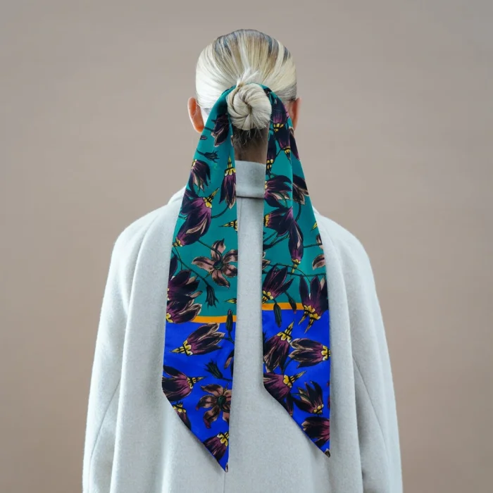 Made of pure soft silk this essential accessory is printed with a graphic floral print, playfully patterned against a vibrant colourful backdrop to lift any outfit. This versatile twilly scarf can be worn in many ways to adorn your look – twirled around your neck, at the waist or as a headband.