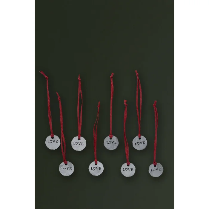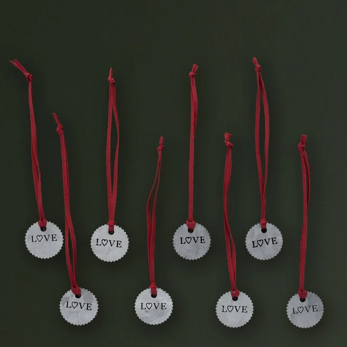 Product: Antique Metal Christmas Tree Ornament With "love" Inscription, 8 Pieces, Metallic