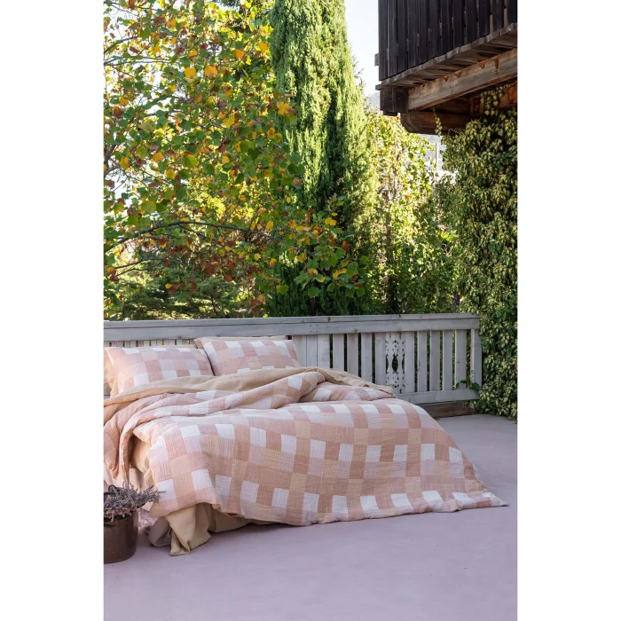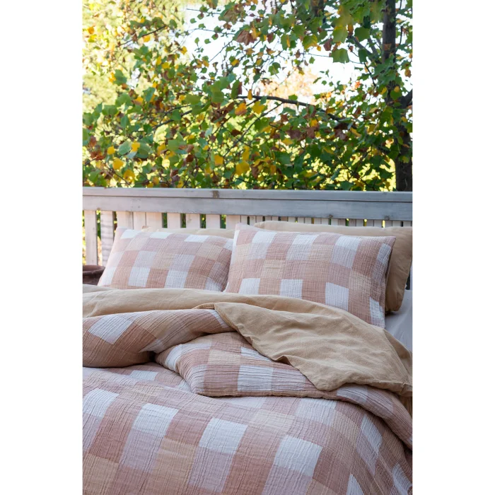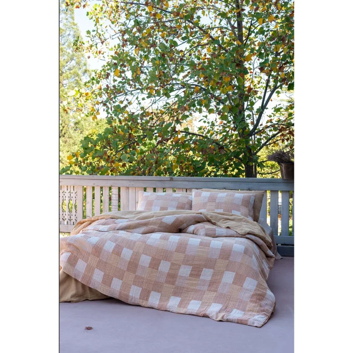Gingham Gauze Duvet Cover offers an elegant and dynamic look by combining the soft texture of three-layer muslin fabric with the classic plaid gingham pattern. The special color tones of the collection add an elegant depth to the pattern, creating a stylish atmosphere. The traditional texture of the plaid gingham pattern meets the softness of muslin fabric, providing a perfect harmony both visually and texturally. Made from 100% cotton, this duvet cover is pre-washed and Oeko-Tex certified, offering comfort and quality together.