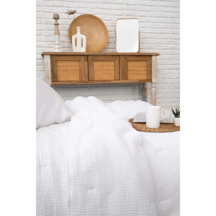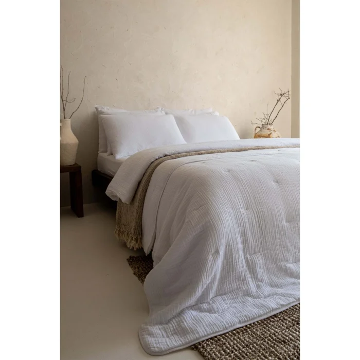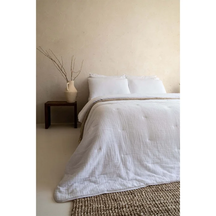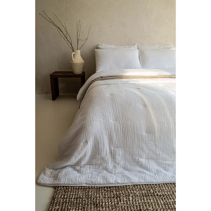 Koza Quilt offers you a sleeping experience among the clouds with its crimped textured fabric made of 100% cotton and fluffy inner filling.; Its soft structure allows you to fall into a peaceful and deep sleep every night; Its stylish embroidery details and elegant design with piping on all edges add elegance to your bedroom, while the Oeko-Tex certification guarantees that the product is safe and free from harmful substances.; With its high-quality inner filling, it provides excellent warming, offering comfort and elegance together.; Outer Surface: 100% Cotton; The inner filling is 100% cotton.