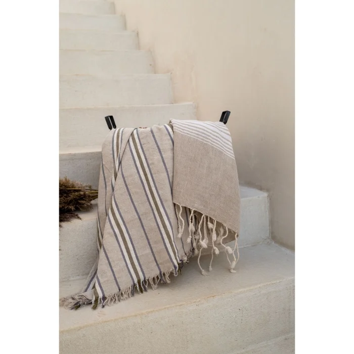 Striped Linen Peshtemal offers excellent comfort at the beach or daily use with the breathable structure and light texture of linen. With its 90x175 cm size, it dries quickly and keeps you cool thanks to its ability to absorb water quickly. Made from natural linen fibers, this loincloth becomes softer with each use and is long-lasting. Made from a blend of 55% linen and 45% cotton, this product boasts eco-friendly and sustainable features. Oeko-Tex certified loincloths are a safe choice for your health. It is pre-washed for extra softness and comes with a practical fabric bag.