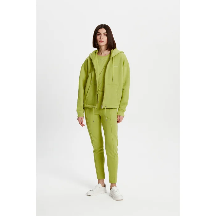 Loose-fitting zip-up sweatshirt with 80% Good cotton, 20% Recycled polyester hood and cord at the waist. The model is 1.74 meters tall and wears a size S. You can choose your own size.